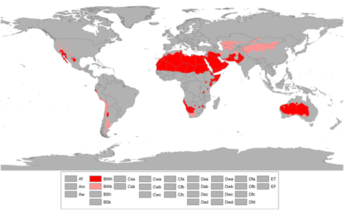 Bu iklimin görüldüğü yerler, kuraklık derecesiyle belirlenir. Yağış eşiği belirlenir. Çökelme eşiği (milimetre cinsinden) ilk olarak ortalama yıllık sıcaklığın °C cinsinden 20 ile çarpılmasını, ardından toplam yağışların %70 veya daha fazlasının yılın yüksek güneşi yarısında (280 Nisan) Kuzey Yarımküre'de ise 280 ilave edilmesi ya da güneyde Ekim ayından Mart ayına kadar ya da toplam yağışların% 30-70'i uygulanabilir süre içinde alınırsa ya da toplam yağışın %30'undan daha azı alınırsa 0'dır. Bölgenin yıllık yağış miktarı eşiğin yarısından az ise, BW (çöl iklimi) olarak sınıflandırılır.