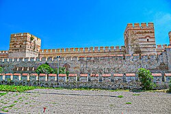 Theodosius Surları'nın Selymbria Kapısı'ndaki restore edilmiş bölümü. Arka planda İç Duvar'ın kulesiyle birlikte Dış Duvar ve hendek duvarı görülebilmektedir.