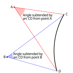 Kesin anlam bağlama göre değişir. Örneğin, açının tepe noktası dairenin merkezi olduğunda, dairenin yayının gördüğü açıdan bahsedilebilir.