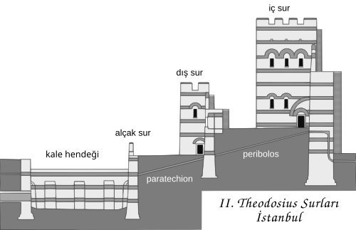 Theodosius Surları, alt dış duvardan (Grekçe: ἔξω τεῖχος) ayrılan ana iç duvardan (μέγα τεῖχος, mega teichos, "büyük duvar") oluşur, exō teichos veya μικρὸν τεῖχος, mikron teichos, "küçük duvar") bir terasın yanında, peribolos (περίβολος). Dış duvar ile hendek arasında (Grekçe: σοῦδα, souda) orada bir dış teras, parateichion (Grekçe: τὸ ἔξω παρατείχιον) uzanıyordu, alçak bir göğüs işi ise hendeklerin doğu yamaçlarını taçlandırıyordu. Her iki terasa da sur kulelerinin yanlarındaki yaya kapıları sayesinde ulaşılıyordu.