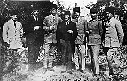 ![]() Sivas Kongresi'nde önemli milliyetçiler. Soldan sağa: Ahmet Muzaffer (Kılıç), Rauf Bey (Orbay), Bekir Sami (Kunduh), Mustafa Kemal (Atatürk), Ruşen Eşref (Ünaydın), Cemil Cahit (Toydemir), Cevat Abbas (Gürer). | |