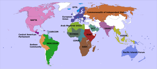Birbiriyle örtüşmeyen birkaç büyük ittifak. Pastel renkler gözlemci/ortak veya aday ülkeleri göstermektedir.