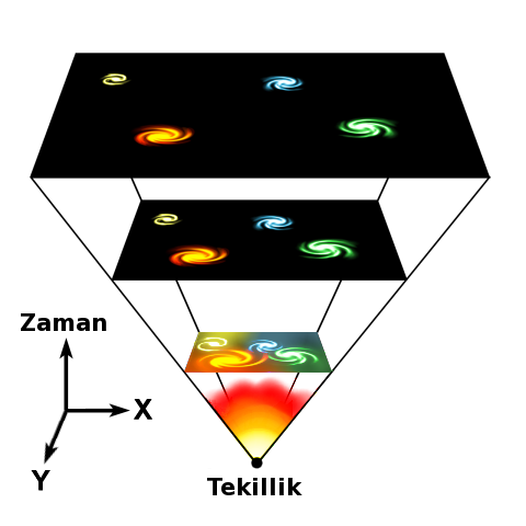 Evrenin oluşumu ve genişlemesi. Big Bang modeline göre günümüzdeki evren 13,5 milyar yıldan biraz daha fazla zaman önce son derece yoğun ve sıcak bir hâlden ortaya çıkmış olup, günümüzde genişlemeye devam etmektedir. Galaksiler içeren uzay metrik olarak genişlemektedir.