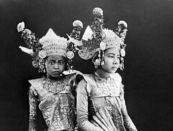 Bali dansına özgü kıyafeti giyen iki genç kız. Resim 1929 yılında Endonezya'nın Hollanda Doğu Hint Adaları adıyla Hollanda sömürgesiyken çekilmiştir (Repronegativ, Tropenmuseum, Amsterdam).