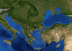 ![]() Balkanlar'ın uydu görüntüsü (NASA) | |