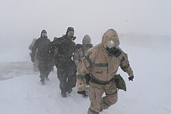 ABD Hava Kuvvetleri Başçavuşu Jess V. Hernandez (sağda), 119. Bakım Filosuna atanmıştır ve Hava Kuvvetleri mensuplarına kimyasal ve biyolojik savaş eğitimine giderken aşırı soğuk, sert rüzgarlar ve karda liderlik ediyor