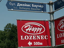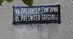 Varna'da resmî transliterasyondan uzaklaşılarak hazırlanmış Almanca bazlı bir sokak tabelası - v yerine w, y yerine j tercih edilmesi