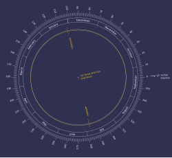 1. ^ Gezegenimizin Güneş'in etrafındaki dönüşü yaklaşık 365 gün sürer. Tam bir yörünge ise 360°'dir. Bu durum, Dünya'nın kendi yörüngesinde her gün yaklaşık 1 derecelik bir yol kat ettiğini göstermektedir. Dolayısıyla, Güneş de yıldızlara göre gökyüzünde aynı miktarda hareket ediyor gibi görünecektir.
