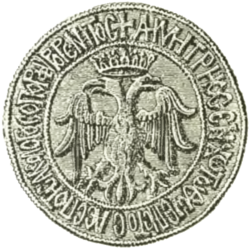 ![]() Dimitrios'un üzerinde "Dimitrios, İsa Mesih'in sadık despotu, Porfirogennetos Paleologos" yazan mührü | |