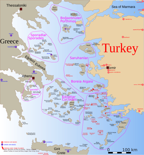 Ege Adaları'nın kendi kıyı karasularının ötesindeki orta Ege Denizi bölgesinin deniz tabanı, 1982 tarihli Uluslararası Deniz Hukuku Sözleşmesi'ne göre, Türkiye kıyılarından 100 deniz mili (185 km.) açığa kadar Türkiye'nin mülkiyetinde olup buradaki maden ve deniz kaynaklarını Türkiye'den başka bir ülke kullanamaz. Bu konuda Lahey Adalet Divanı da aynı şekilde görüş bildirmektedir. Yani uluslararası hukuka göre adaların yalnızca 6 ya da 12 mil karasuları olabilir ama 200 mile kadar kıyı ülkesine işletme hakkı veren Münhasır Ekonomik Bölge hesabına adalar dâhil edilemez şeklinde görüş açıklamaktadır.
