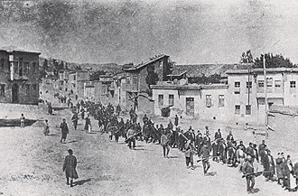 Osmanlı askerleri eşliğinde Harput'tan Mezire (günümüzde Elâzığ) yakınındaki bir hapishaneye götürülen Ermeni savaş esirleri ve iş birlikçi olduğundan şüphelenilen kişiler. Nisan 1915