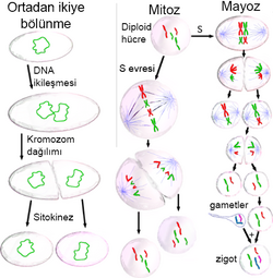 Zigot oluştuktan sonra başlayan mitoz bölünme, organizma belli bir büyüklüğe erişinceye kadar çoğu soma hücresinde (ör sinir hücrelerinde bölünme yoktur) ve bazı hücrelerde (kemik iliği vb.) hayat boyu devam eder. Mitozda her hücrenin çekirdeğinde kromozomlar kendini eşler. Eşler, ana hücrenin bölünmesiyle oluşan iki yavru hücreye verilir. Böylece ana hücreye benzeyen, diploid sayıda (2n) kromozomlu iki yavru hücre meydana gelir.Yavru hücrelerin kromozomlarının 23 tanesi anneden 23 tanesi babadan gelir.Bu kromozomların 44 tanesi vücut özelliklerini diğer ikisi cinsiyeti gösterir. Mitoz da çekirdek bölünmesi karyokinez, sitoplazma bölünmesi sitokinez olarak tanımlanır. Karyokinez başlangıçta interfaz ve sonrasında gerçek bölünme evreleri olan profaz, metafaz, anafaz ve telofaz olarak görülür. Tek hücreli bir hücrede çoğalma (üreme), mitoz hücre bölünmesi ile sağlanır.