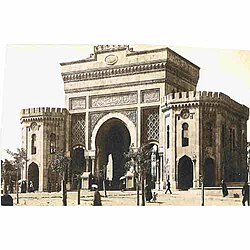 Günümüzde İstanbul Üniversitesi olarak kullanılan Harbiye Nezareti binasının girişi (1898)