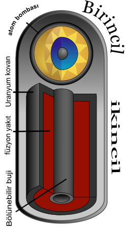 Modern füzyon silahları, 235U veya 239Pu kullanılan birincil nükleer fisyon aşaması ile termonükleer yakıt içeren ayrı bir füzyon aşamasından oluşmaktadır. Bu yakıt, saf element olarak ağır hidrojen izotoplarında (döteryum ve trityum) veya modern silahlarda lityum döterit formunda bulunmaktadır. Bu nedenle, termonükleer silahlar genellikle hidrojen bombası veya H-bombası olarak adlandırılmaktadır.