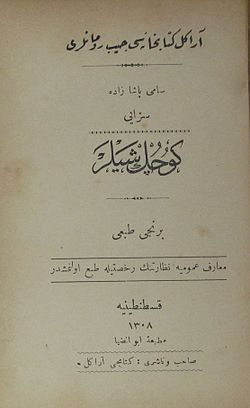 ![]() 1891'de Matbaa-i Ebüzziya'da basılan kitabın giriş sayfası, Neşreden: Kitapçı Arakel | |