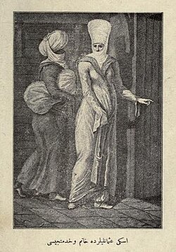 Ahmet Refik Altınay'ın Kadınlar Saltanatı adlı kitabının 1916 baskısında kullandığı temsili resim (Latin Alfabesiyle alt başlık: Eski Osmanlılarda Hanım ve Hizmetçisi)