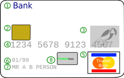 Kredi kartlarında EMV çipi, kabartma bant, hologram, banka kartı numarası, kart ağı logosu, son kullanma tarihi, kart sahibinin adı, temassız çip, manyetik şerit, Kart Güvenlik Kodu gibi bilgiler bulunur.
