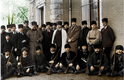 Yozgat Ayaklanması'nı bastırmak üzere görevlendirilen Çerkez Ethem (Atatürk'ün sağında) ve adamları, Ankara Garı'nın karargah binası önünde Mustafa Kemal Paşa'yla (Haziran 1920)