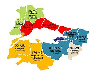 İnegöl; Mobilya, Tekstil, İplik, Orman ve ağaç ürünleri konusunda bölümün Bursa'dan sonra en gelişmiş merkezidir. Yine Bursa, Bandırma, Balıkesir, Çanakkale, Yalova ve Bilecik'de gıda sanayi, Balıkesir'de şeker ve kağıt sanayi, Bursa'da tekstil, otomotiv ve konserve sanayi, Bandırma beyaz et üretimi ve kimya sanayi, Erdek, Mudanya, Gemlik, İznik ve Gölyazı ise turizm konusunda gelişmiştir.
