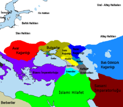 ![]() 650 yılında Oğur dilleri konuşan Bulgarlar ve Hazarların dağılımı | |