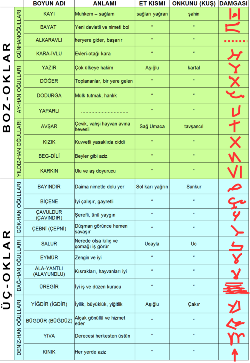 | "Gün Han" Kayı Bayat Alkaevli Karaevli | "Ay Han" Yazır Döğer Dodurga Yaparlı | "Yıldız Han" Avşar Kızık Beğdili Karkın | "Gök Han" Bayındır Beçenek Çavuldur Çepni | "Dağ Han" Salur Eymür Alayuntlu Yüreğir | "Deniz Han" İğdir Büğdüz Yıva Kınık | ||||||||||||||||||||||||||||||||||||||||||||||||||||||||||||