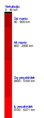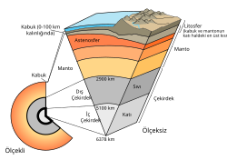 - Kıtasal kabuk, 35 km kalınlığındadır. Himalayalar ve Kayalık dağlarında 70 km'yi bulur. Birçok kaya türünden oluşur.
