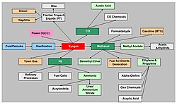 Syngas veya (sentez gaz) olarak da bilinen gaz en büyük etken olan hidrojen ve karbonmonoksit dahil olmak üzere karbondioksit, metan gibi bileşenleri içeren bir yakıt gazı karışımıdır. Syngas genellikle kömür gazlaştırma ürünüdür ve ana uygulama alanı elektrik üretimidir. Syngas ayrıca Fischer-Tropsch yöntemi ile benzin ve dizel gibi nakliye yakıtlarına dönüştürülebilir. Sentez gazı, doğrudan yakıta karışabilir veya metanol yardımıyla benzine dönüştürülebilir. Fischer-Tropsch teknolojisi ile birleştirilmiş gazlaştırma, Güney Afrika'nın Sasol Kimya Şirketi tarafından kömür ve doğalgazdan motorlu taşıt yakıtları yapmak için kullanılmaktadır.